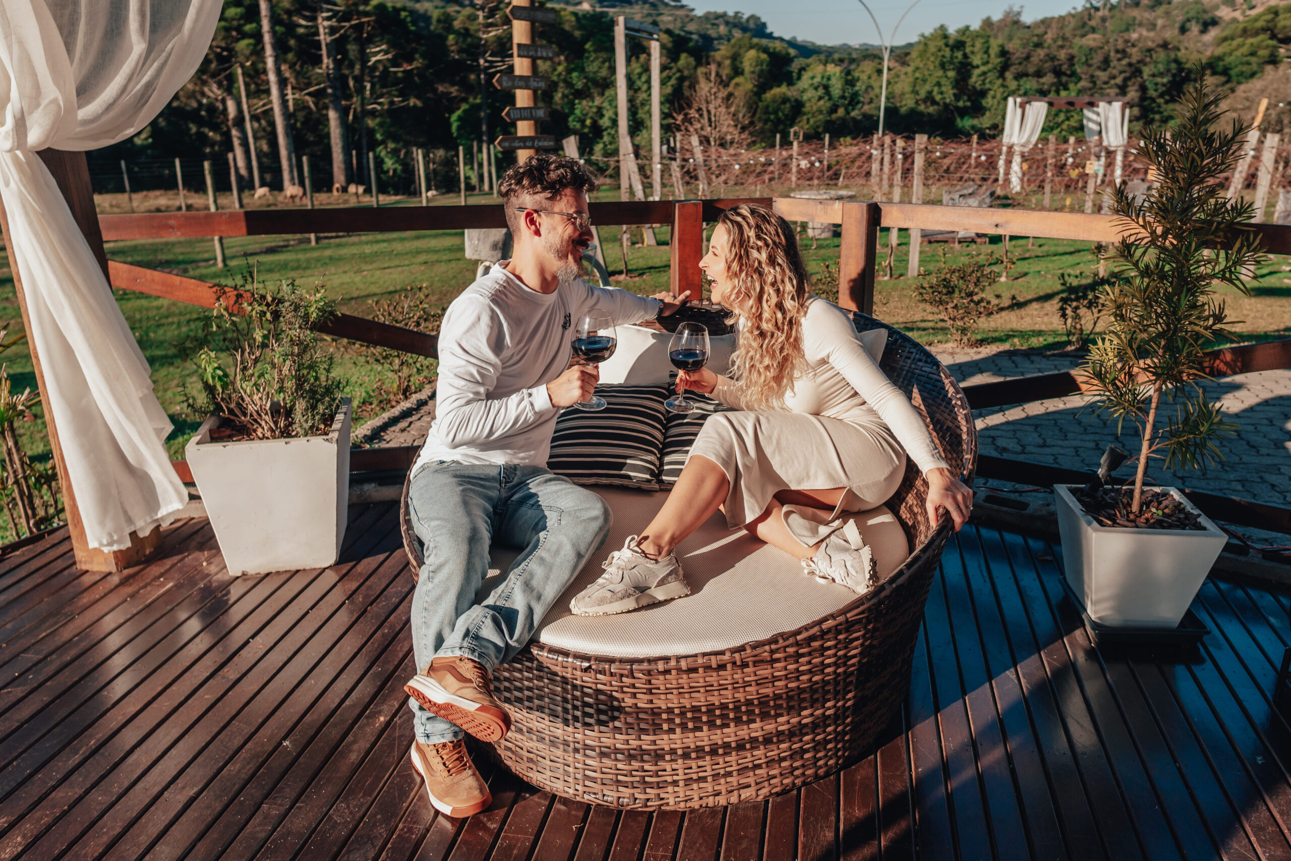 O espaço, iluminado pelo charme natural dos parreirais ao entardecer, cria a atmosfera perfeita para conversas leves, risadas espontâneas e um toque de sofisticação.